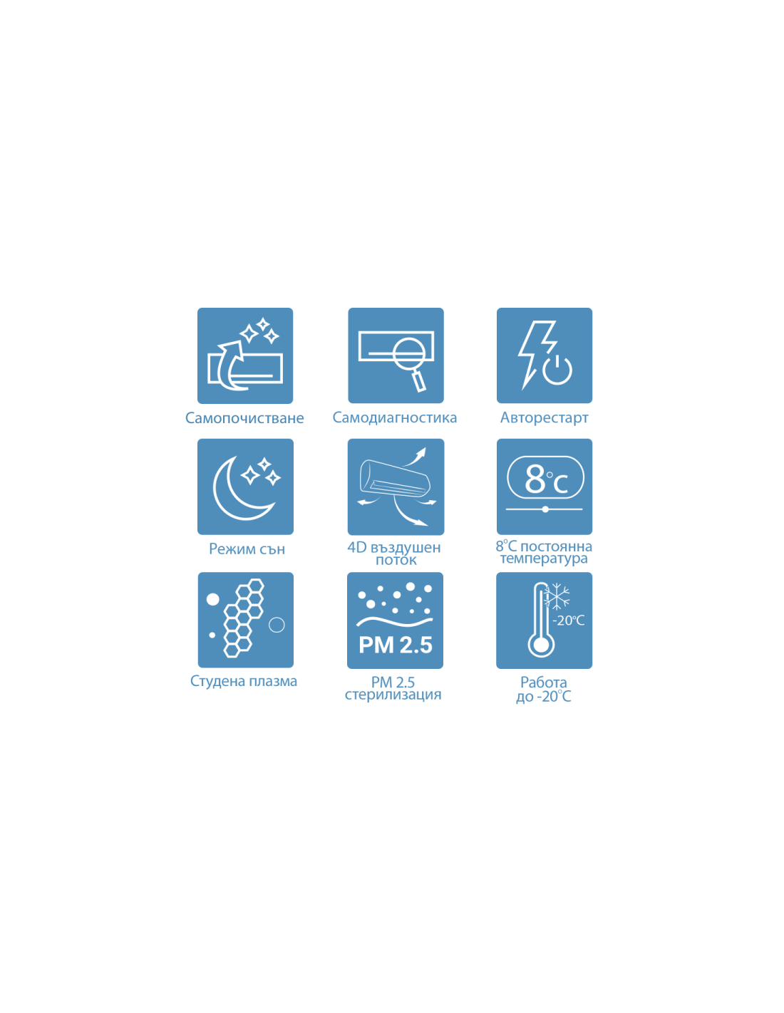 | 8 ºС постоянна температура Климатикът ще поддържа минимална температура от 8 ºС, предотвратявайки свръх охлаждане на жилището. |